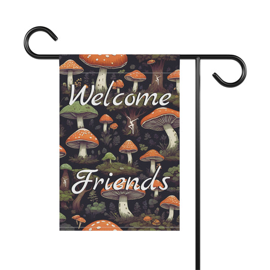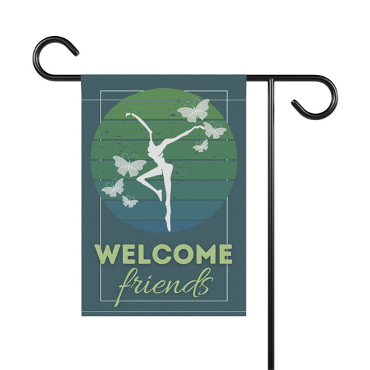 home/garden flag - 12"x18" indoor/outdoor - double sided - DMB - teal welcome friends - butterflies - sleeve at top -*POLE NOT INCLUDED